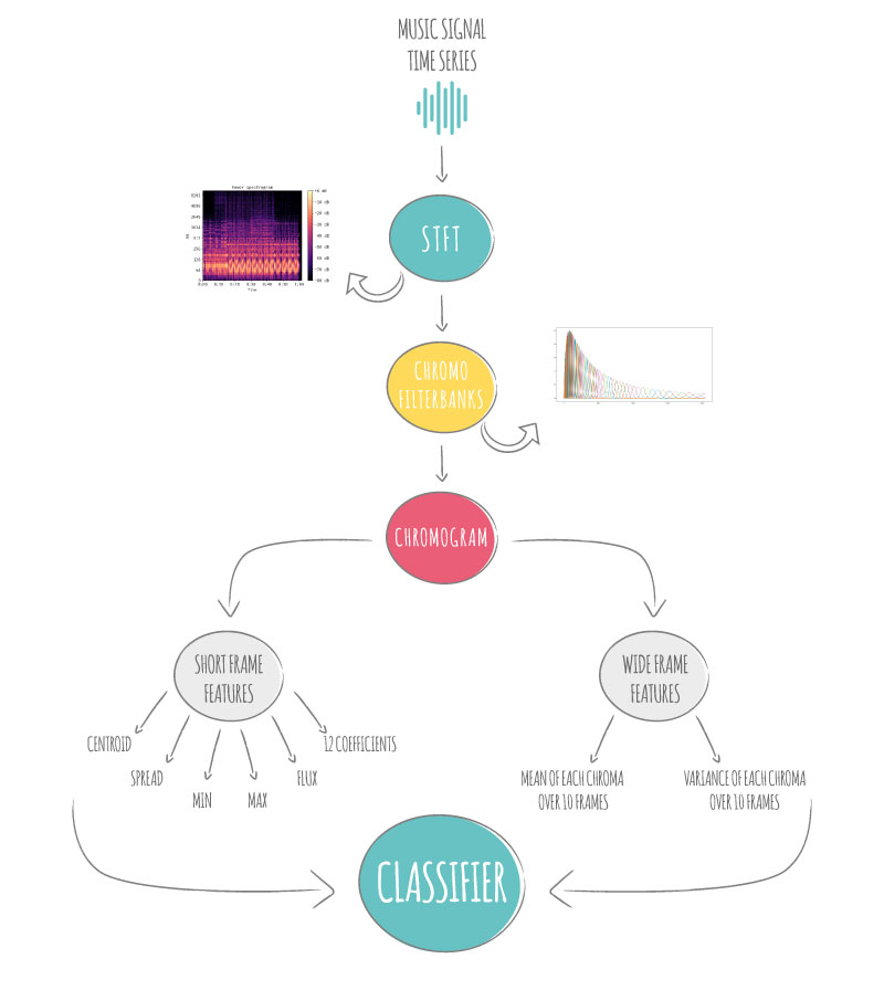 | Classical, Jazz, Metal | Mean and Variance of 12 Chroma Coefficients | 0.232s(4096) | MLP(12,8,6) | 70.1% |